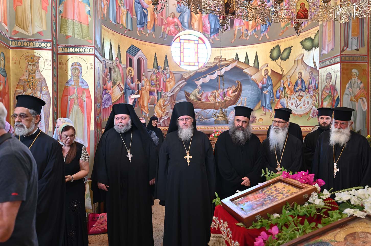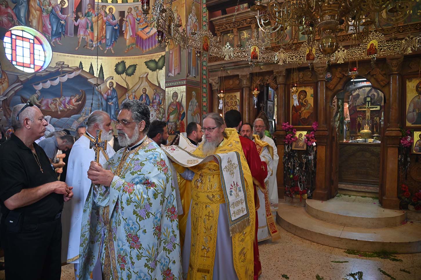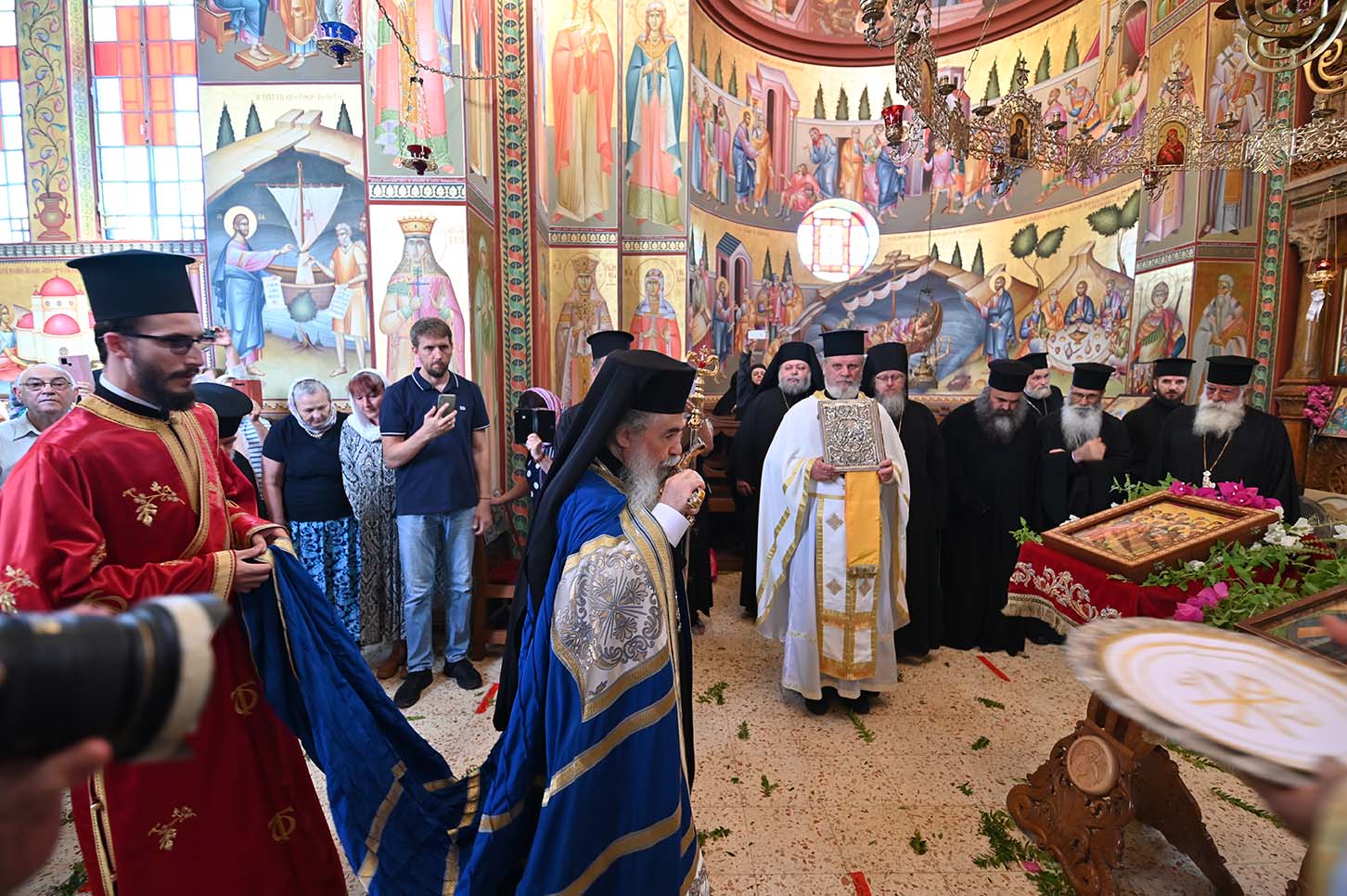 Архимандрит Роман в сопровождении монахов РДМ, отцов Авенира и Киприана прибыл рано утром в храм св. Апостолов и был сердечно встречен смотрителем монастыря монахом Иринархом. Вскоре прибыл Патриарх Иерусалимский и всея Палестины Феофил III со своей свитой. Затем Его Блаженство направился в храм для совершения Божественной литургии. Патриарху сослужили Высокопреосвященные митрополит Назаретский Кириак, митрополит Аристарх Константинский и архиепископ Исидор Иерапольский, с большим количество духовенства из разных приходов Галилеи. Хором, который пел на греческом, арабском и славянском языках, управлял Высокопреосвященный архиепископ Мадавский Аристобул. Божественная литургия была отслужена с большой торжественностью. Многие прихожане говорили по-русски, так как церковь Святых Апостолов является приходской церковью для русских верующих, проживающих на севере Израиля.
